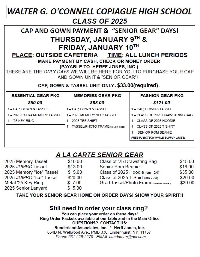 WALTER G. O'CONNELL COPIAGUE H.S.ATTN: CLASS OF 2025 & 2026!OFFICIAL CLASS RING/JEWELRY ORDERING DAYS!WEAR YOUR RING WHILE YOU ARE IN HIGH SCHOOL! DON'T MISS OUT! PARENT/STUDENT RING ORDER NIGH...